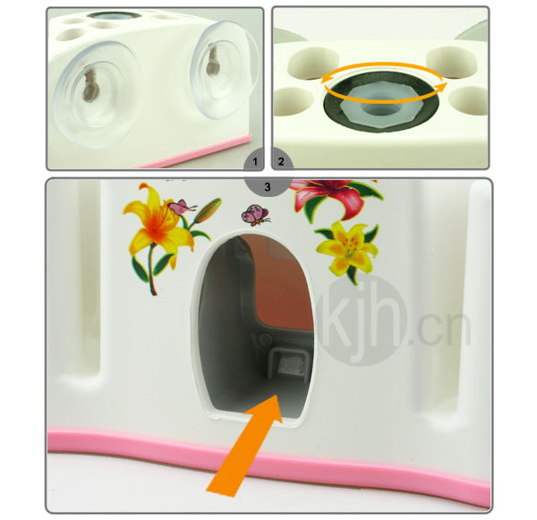 • 1.產(chǎn)品背部附強(qiáng)力吸盤,可固定在玻璃或光滑表面,更省空間。