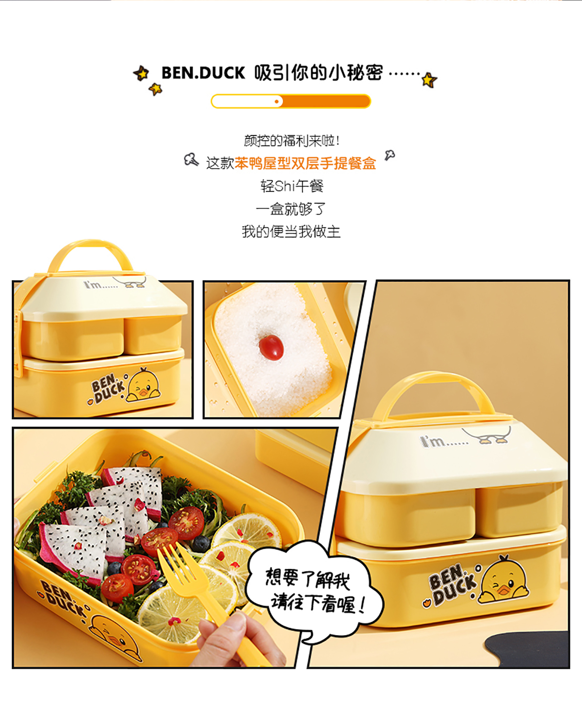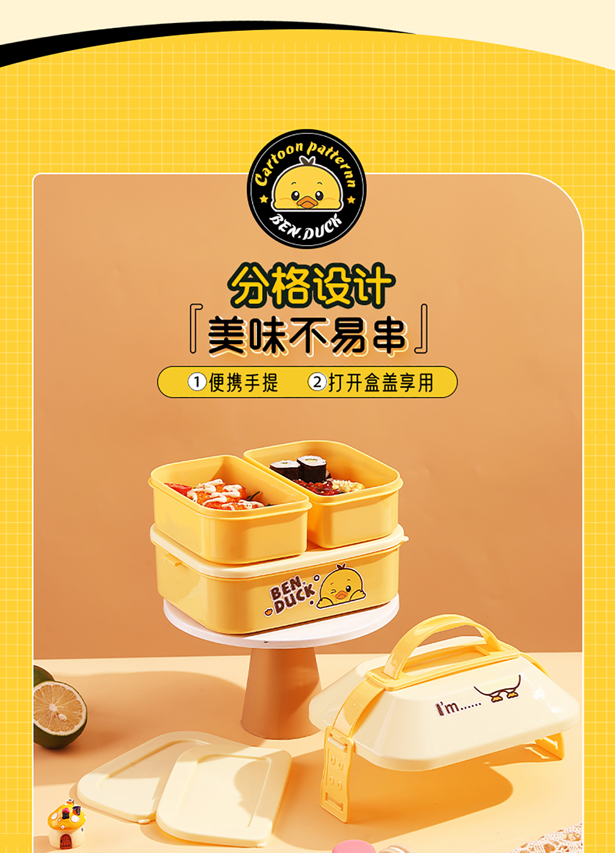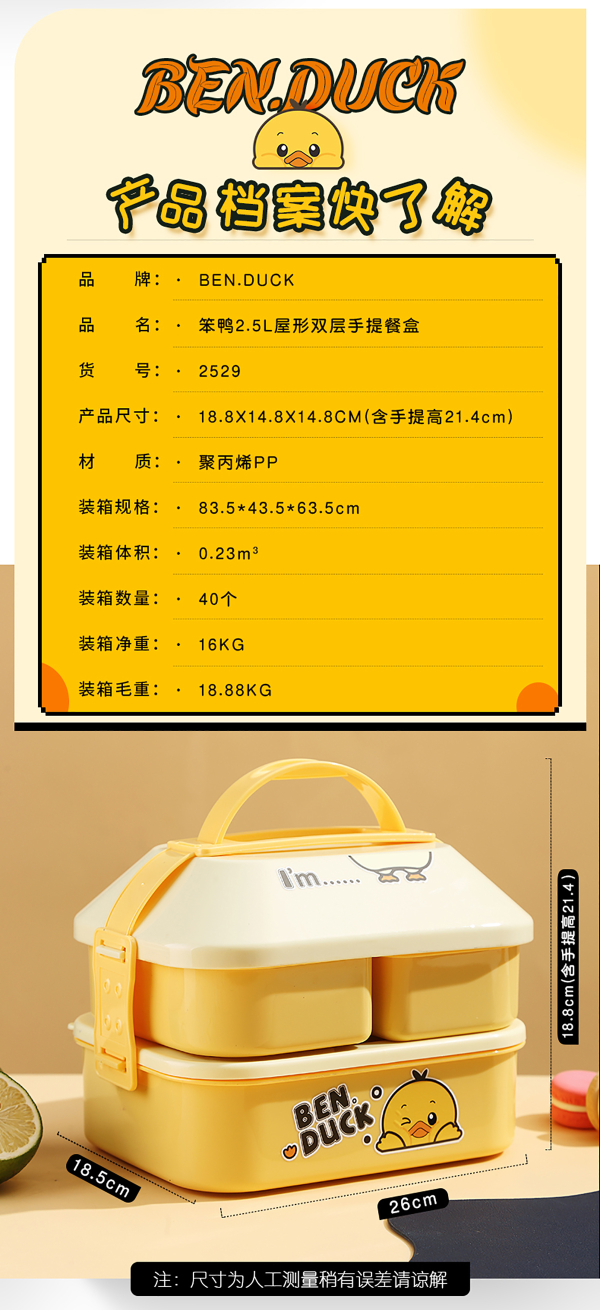笨鴨2.5L屋形雙層手提餐盒(配PP勺叉)(1400ml+550mlx2)