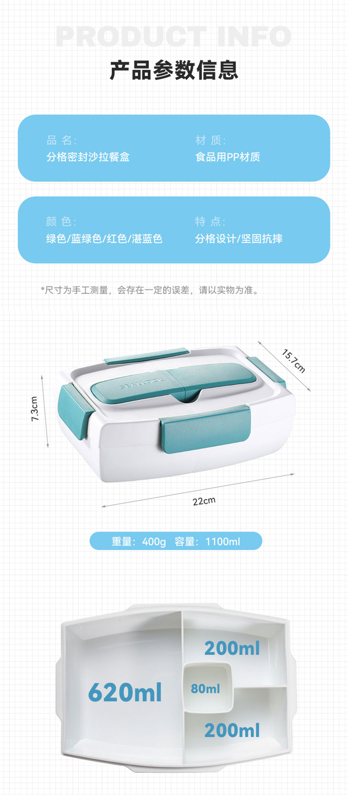 沙拉餐盒1100ml(四格分格密封)