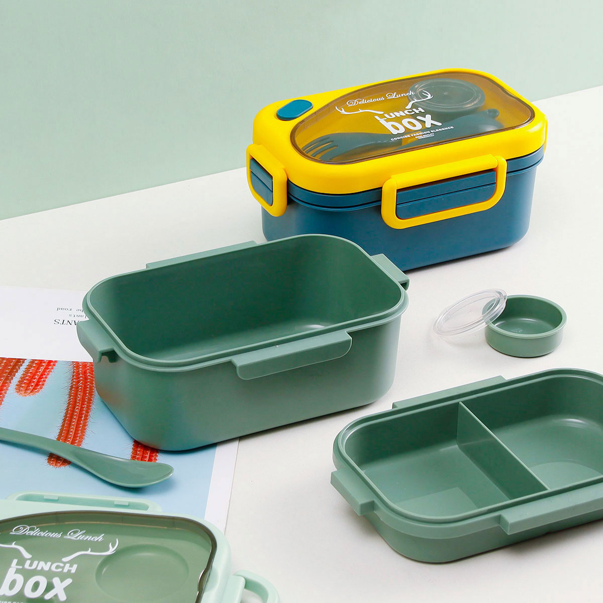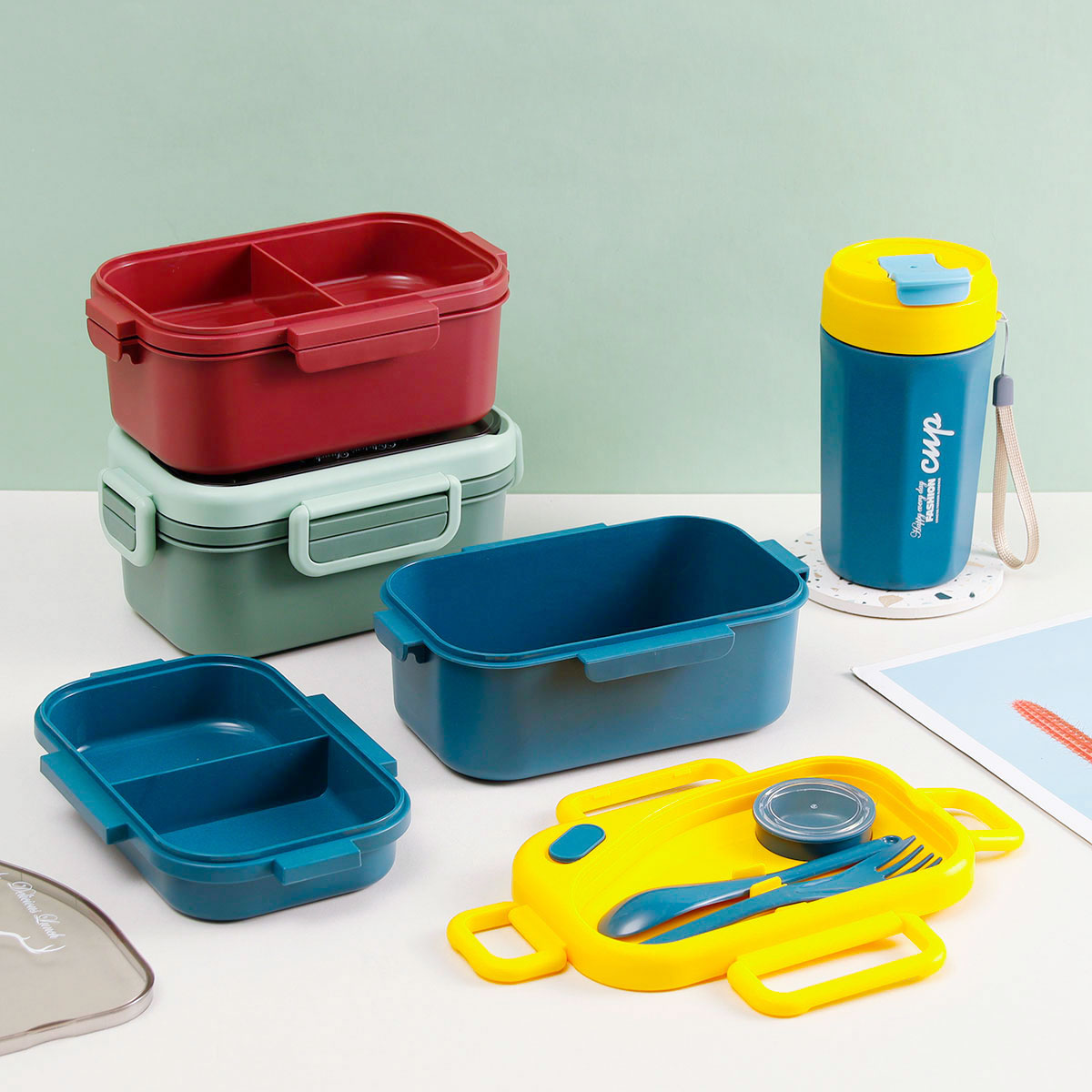 品悅長方雙層密封飯盒(1100ml)(含醬料盒)+圓形/八角隨行杯(500ml)