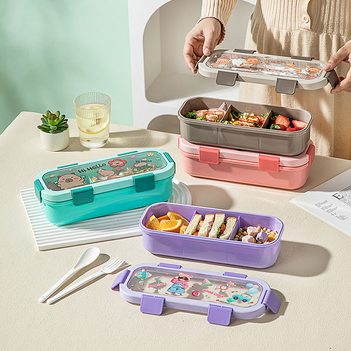 (印花款)愛(ài)悅長(zhǎng)方形便當(dāng)盒兩格/三格可選  塑料款/不銹鋼款